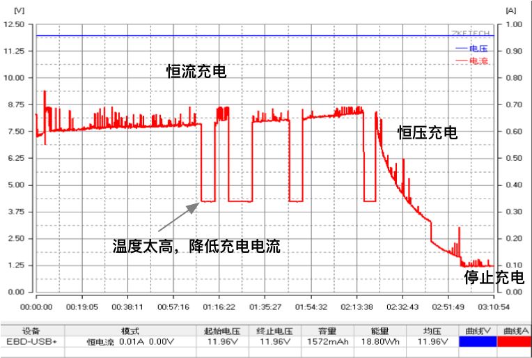 - 下圖為無線充電器給三星手機充電典型的充電曲線。涓流充電分辨不出,在很多情況下會被省略。溫度過高時,電池充電芯片會自動降低充電電流。