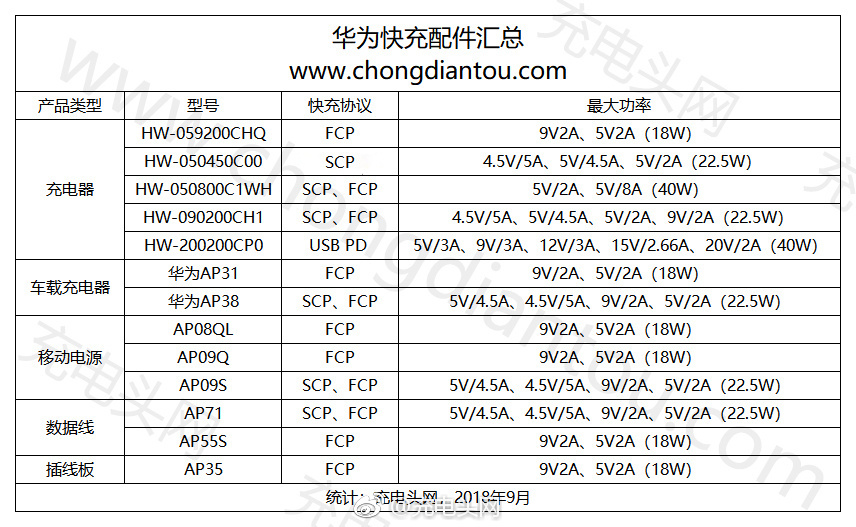 據充電頭網統計,目前華為旗下支持FCP/SCP快充的配件共有12款,其中充電器5款,車充2款,移動電源3款,數據線2款,插線板1款,支持SuperCharge超級快充的配件為6款。