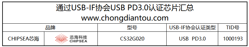 芯海科技研發(fā)的CS32G020是一顆雙向USB PD協(xié)議芯片,目前已經(jīng)通過了協(xié)會(huì)的USB PD3.0認(rèn)證(TID號(hào)為1000193)。