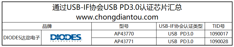 目前DIODES旗下的AP43770(TID號(hào)為1090017)和AP43770(TID號(hào)為1090028)兩款芯片已經(jīng)通過可USB-IF協(xié)會(huì)的PD3.0認(rèn)證。