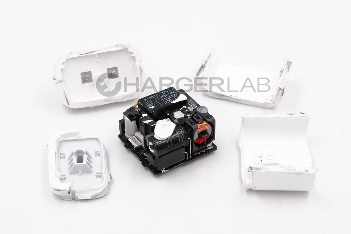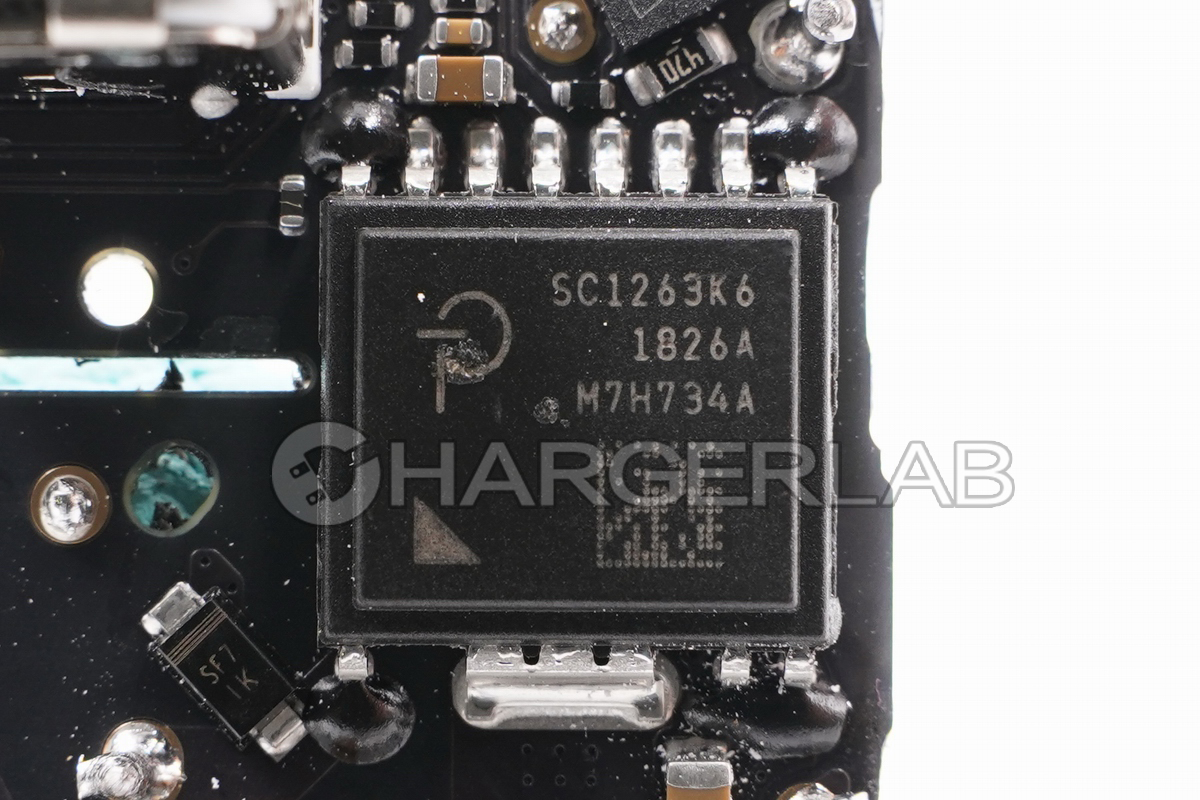 清理完PCB上的保護框架得以看到內部的電源主控芯片和快充協議芯片。其中電源芯片來自美國PI公司,型號為SC1263K6,這是一顆專為蘋果公司定制的高集成度電源芯片。PI在電源主控芯片中將初級、次級電路合封為一顆,這是PI的獨門絕技。