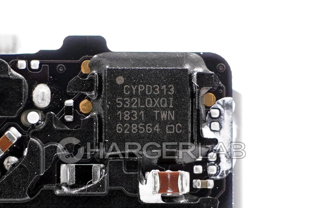 另一顆快充協議芯片負責USB PD的握手通訊,來自賽普拉斯公司,型號為CYPD313,這也是一顆專為蘋果定制的型號,內部還燒錄了蘋果充電器SN編碼。