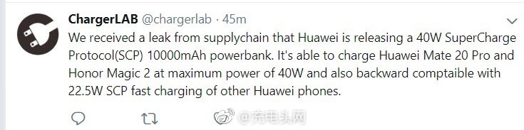 除此之外,這么大功率主要為Mate 20 Pro以及榮耀Magic 2量身打造,目前華為這兩個機型均支持40W超級快充。