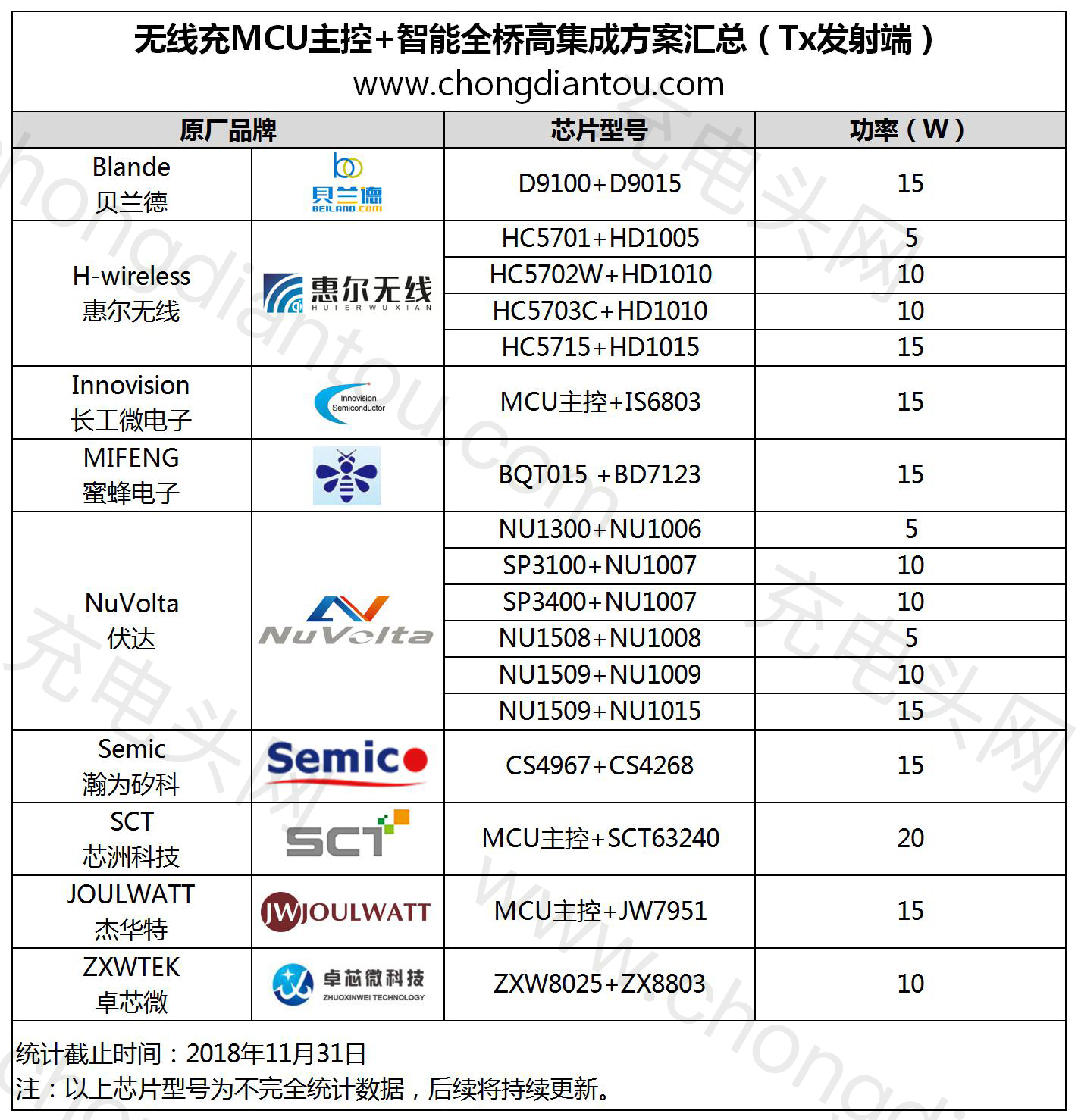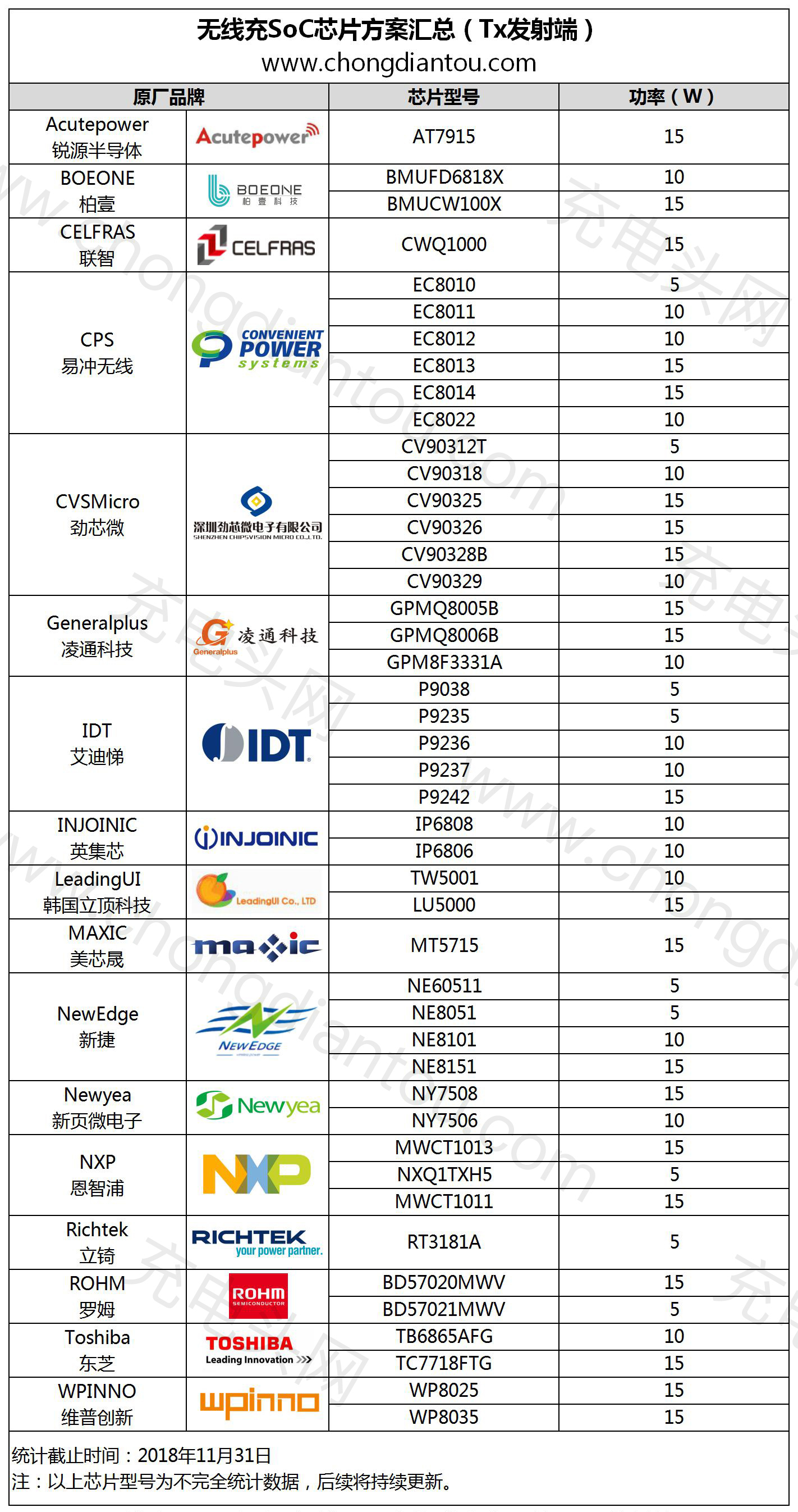 據充電頭網不完全統計,目前有17家芯片原廠推出有SoC無線充方案(集成主控+驅動IC),芯片型號多達45款,涵蓋5W、10W、15W。