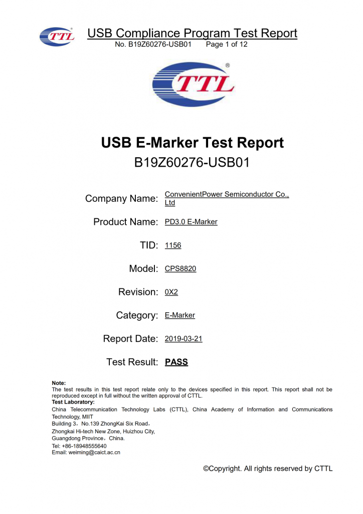目前,易沖CPS8820已經通過了USB-IF協會取樣認證測試環節,TID號為1156。如有產品需求,可與易沖半導體原廠取得聯系。