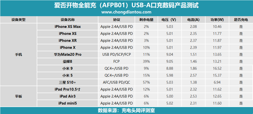 做成表格方便大家觀看,從圖中可以看到,愛否開物全能充的USB-A口可以給絕大多數設備開啟相對應的最佳協議充電,但三星S10+并未開啟QC快充。