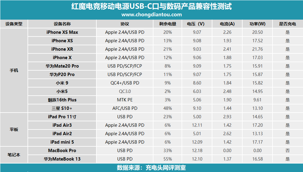 紅魔電競移動電源USB-C口兼容性在給手機、平板充電時表現不錯,均能為其充電;另外除魅族16th Plus之外,其余手機、平板設備均握手相對應快充協議充電,這也表面該移動電源USB-C口不支持PE快充;而對于筆記電腦的兼容性則出現有不能充電的情況,兼容性欠佳。