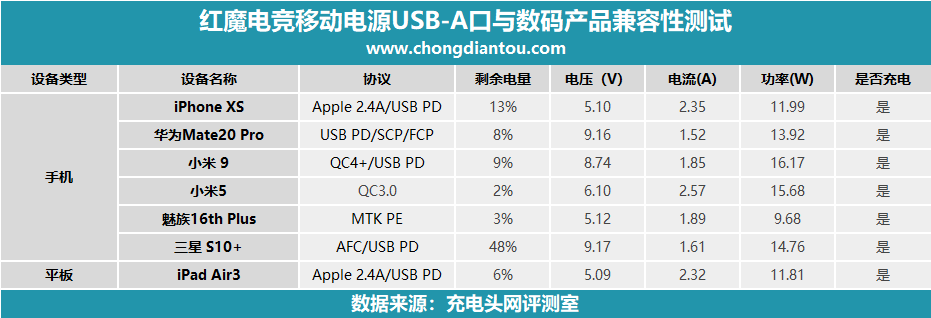紅魔電競移動電源USB-A口兼容性表現不錯,除了魅族16th Plus外均能握手相對應協議充電。