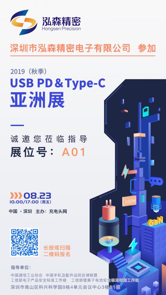 泓森精密將參加8月23日舉辦的2019(春季) USB PD&Type-C亞洲展,展位設在A01,需要了解USB-C、USB-A母座的觀眾可在展會當天前往A01展位詳細交流。