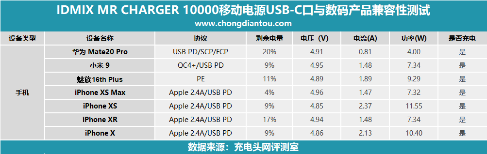 小編把IDMIX MR CHARGER 10000多合一移動電源USB-C口測試過的數碼產品兼容性數據做了統計,可以看到這款移動電源的USB-C接口兼容性有一些問題,在實驗過程中無法為iPhone XS Max、iPhone XR開啟Apple 2.4A充電,安卓手機都能開啟充電但不支持相關快充協議。