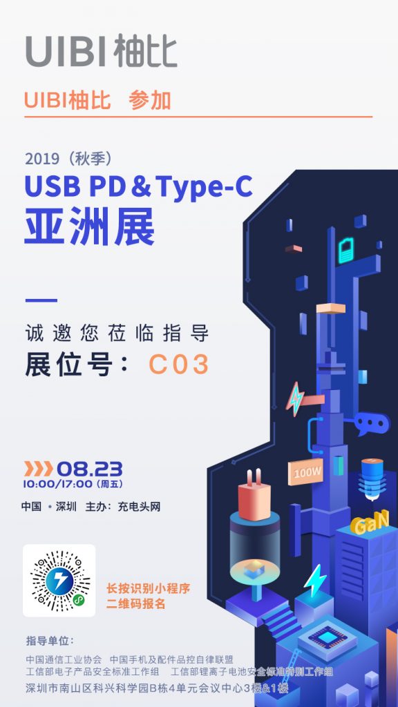 UIBI柚比將于2019年8月23日出席參加充電頭網舉辦的2019(秋季)USB PD&Type-C亞洲展,展臺位于C區C03,歡迎大家前來咨詢!