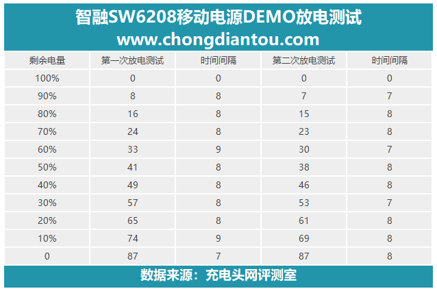 通過表格可以看到,以18.5W恒功率放電,在兩次測試中,電池組均可持續放電87分鐘。同時也可以看到,電量每減少10%,間隔時間均在8分鐘左右,間隔非常均勻。這也就是說,智融SW6208內置的庫侖計在放電時,可以實時、精準的計量電池電量,并通過LED屏幕顯示出來。