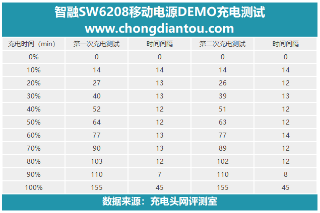 在放電結束的基礎上,小編又對其進行了兩次充電測試。測試中,選用支持18W快充的USB PD充電器對智融SW6208移動電源DEMO充電,每增加10%電量,記錄一次充電時間。匯總得到下表: