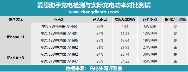 將本次實驗所有數據進行匯總,得到以上結果。可以發現在iPhone手機22W快充、iPad 35W快充時無法正確識別,小編猜測是因為愛思助手設置的功率識別段只有5W/12W/18W/27W/30W/45W等,iPhone充電功率在22W時歸到了27W這個段位之中,iPad充電功率在35W時歸到了45W這個段位。