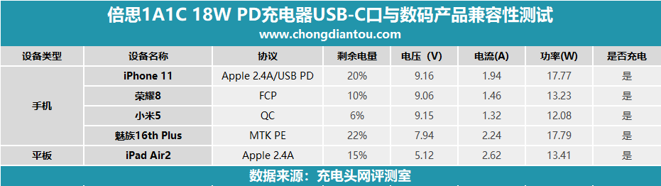 倍思1A1C 18W PD充電器USB-A口兼容性很不錯,與測試設備均能握手相對于快充、協議。