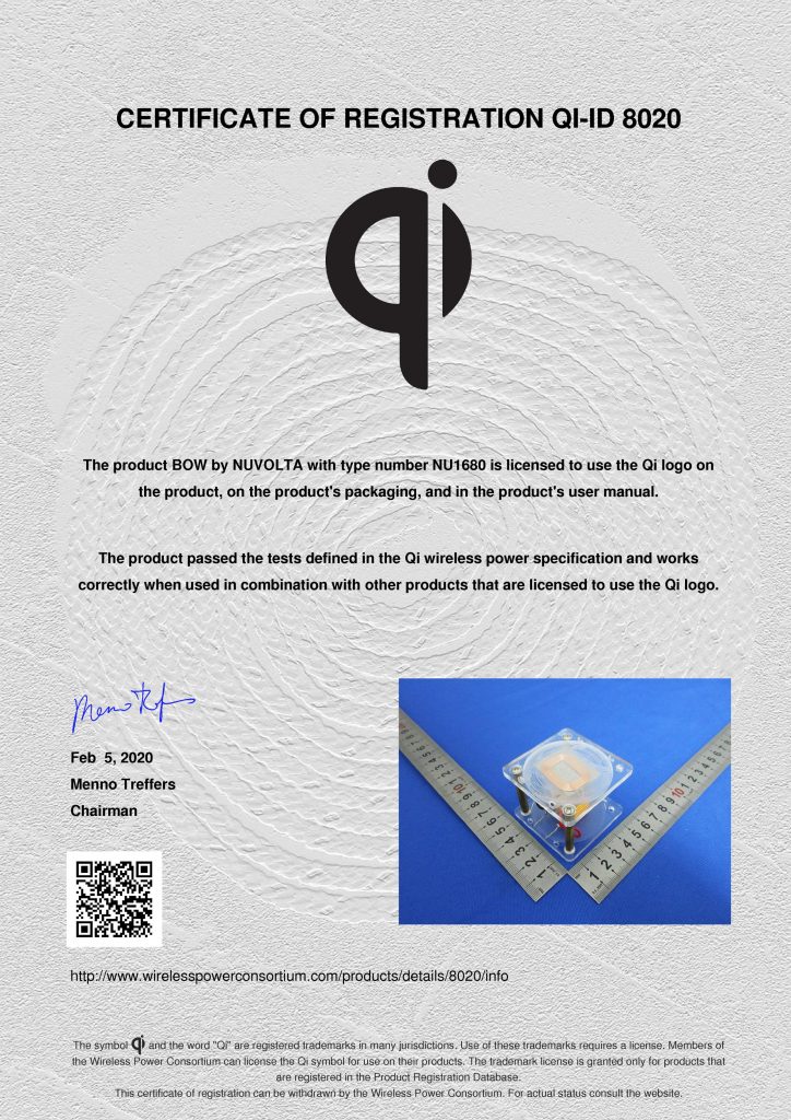 伏達(dá)NU1680模組已于2020年2月5日正式通過Qi認(rèn)證:我們登陸WPC官網(wǎng),發(fā)現(xiàn)一款名為NUVOLTA BOW的伏達(dá)NU1680模組通過了最新Qi認(rèn)證(WPC V1.2.4版本),Qi認(rèn)證ID為8020,認(rèn)證類型為BPP,產(chǎn)品類型Rx無線充電接收。
