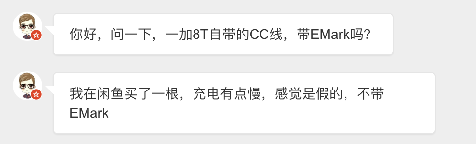 8、一加8T自帶的CC線帶EMark嗎?在閑魚買了一根,充電有點(diǎn)慢,感覺是假的。