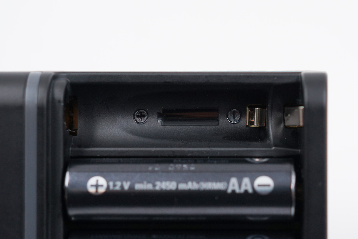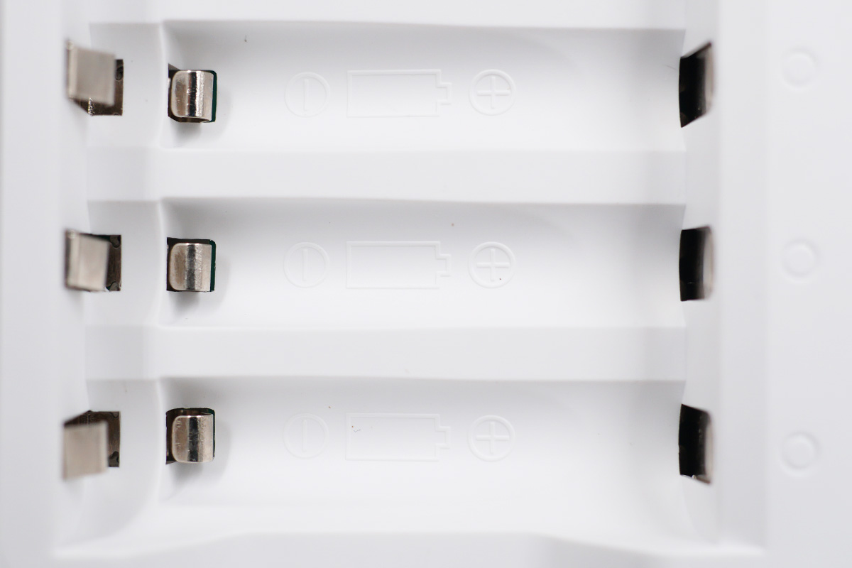 電池卡位也是雙卡位設計,兼容AA電池與AAA電池,卡位底部還帶有電池正負極指示的標識。