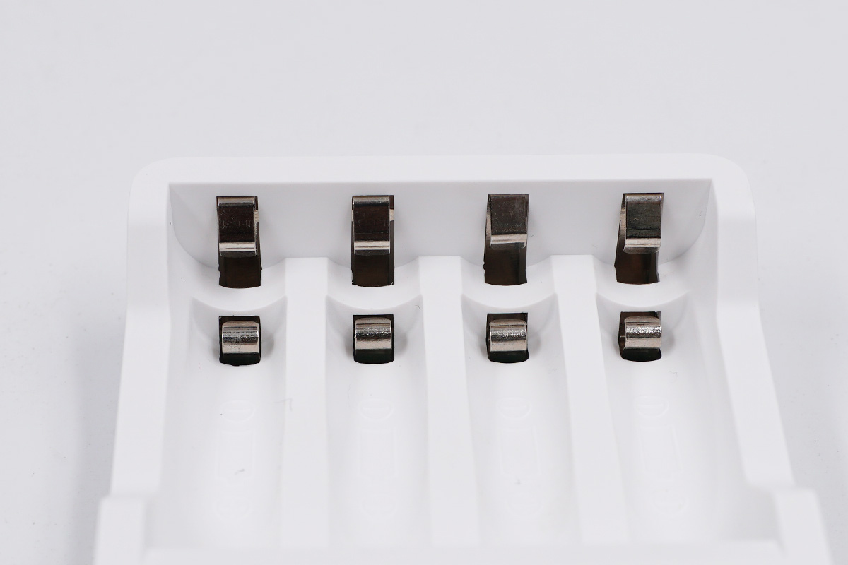 負極特寫,上下各4個彈片共8個彈片,上面是為5號可循環充電的電池充電,下面是7號電池使用的卡位。