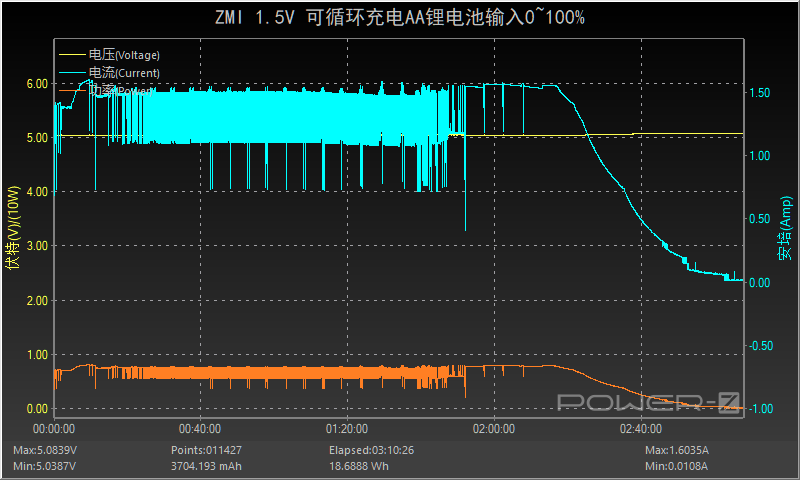 這是為紫米1.5V AA電池充電的過程,在2小時7分前一直持穩定的輸入狀態,隨后功率和電流逐漸下降直至充電結束,全程耗時約3小時。