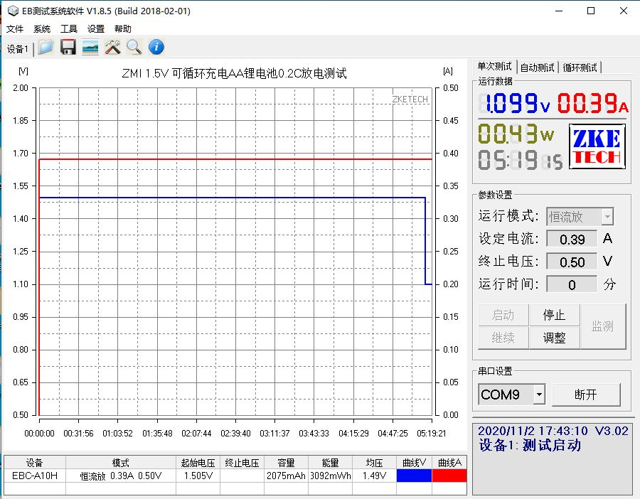 按照紫米的電池容量為1930mAh計算,0.2C的放電標準也就是放電電流為0.39A。采用恒流放的方式,環境溫度約為25°的情況下進行測試,終止電壓設定為0.5V。整個放電的過程持續了約5小時19分,實際放出的能量為3092mWh,實際能量比參數中標稱的2900mWh還多了192mWh,由此可見參數方面為實標,能量充足。