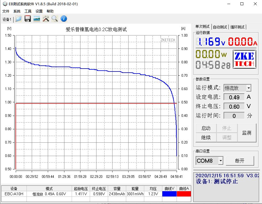 按照愛樂普的電池容量為2450mAh計算,0.2C的放電標準也就是放電電流為0.49A。采用恒流放的方式,環境溫度約為25°的情況下進行測試,終止電壓設定為0.6V。可以看到整個放電過程中電壓是以曲線的方式逐漸下降的,也就是說隨著的電池的使用內部的電壓是一直在逐漸下降的,整個過程持續了約4小時58分,放出的能量約為3001mWh。
