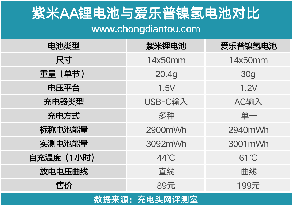 紫米AA鋰電池的電池容量為1930mAh,電池能量為2900mWh;而愛樂普鎳氫電池的電池容量為2450mAh,電池能量為2940mWh。