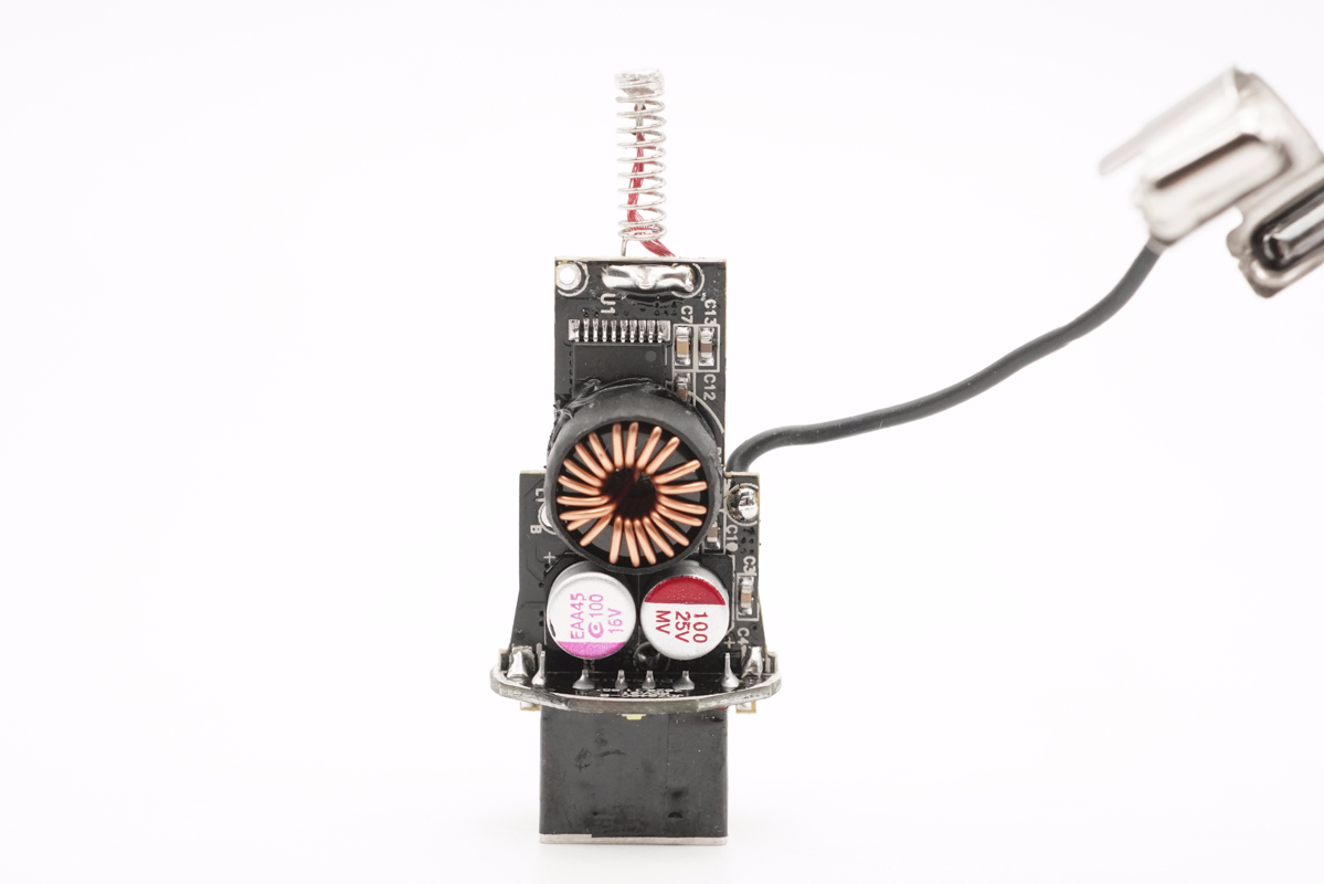 PCB板正面一覽,設有輸入濾波固態電容以及USB-C電路降壓電感,負極彈片使用導線和PCB板連接。