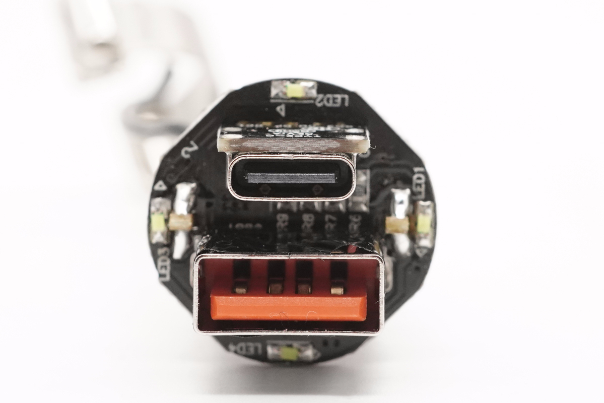 從側面看去,車充由兩塊小板組成,輸入端小板兩面均設有電感與濾波電容,輸出端小板上焊接USB母座。