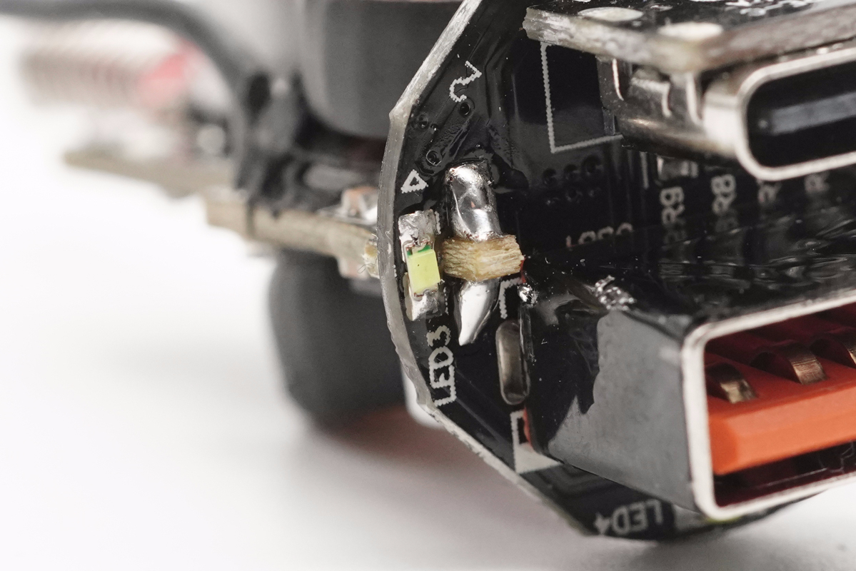 USB-A電路降壓電感特寫,外套熱縮管并打膠加固。