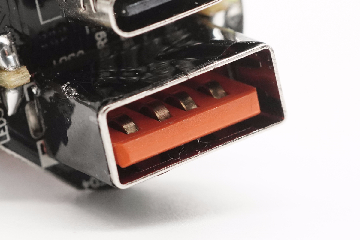 USB-A母座特寫,金屬殼纏繞膠帶防塵。