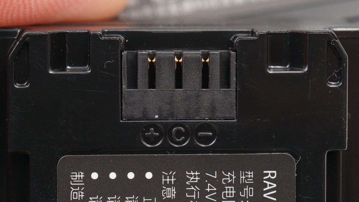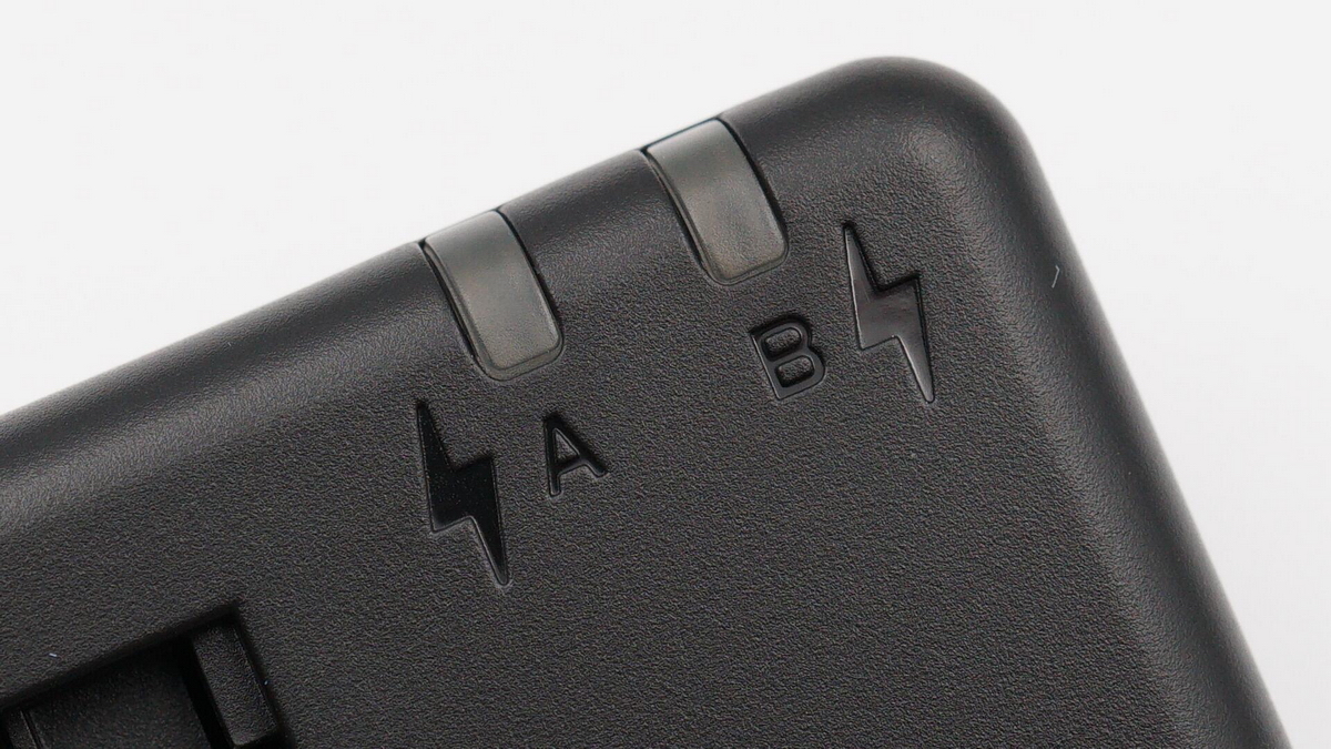 充電槽特寫,插槽邊設有A和B字樣加以區別,用于對應LED指示燈。槽內設有定位板和正負極觸點,旁邊是正負極標識。