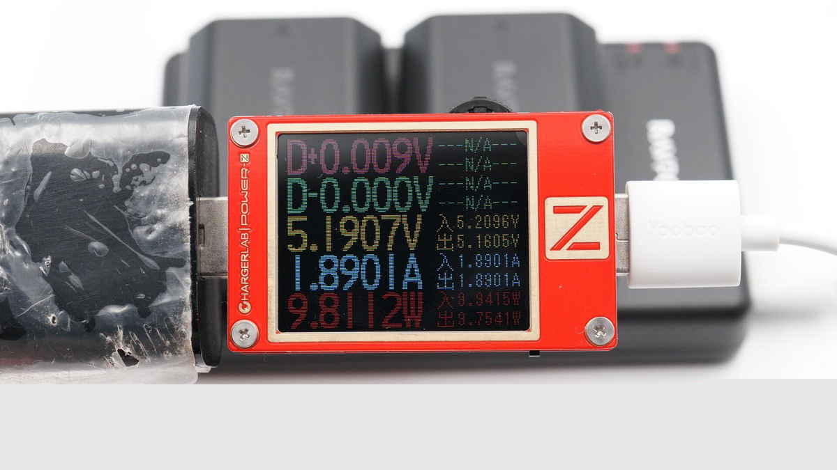 同時給兩塊電池進行充電,使用ChargerLAB POWER-Z KT002測得輸入功率為5.2V 1.9A 9.8W,符合產品標稱。