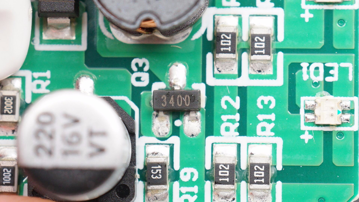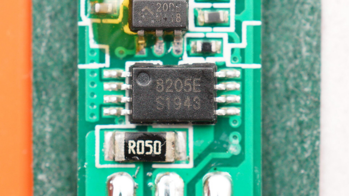 8205E電池保護管,下方是輸出電流采樣電阻。