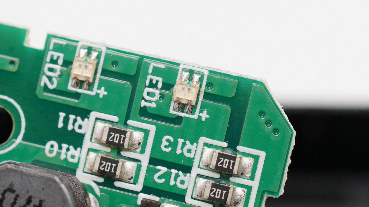 PCB板正面一覽,以中間的芯片分界設有兩個獨立的升壓電路,電感、電容、二極管成對配置,中間的芯片用于控制升壓充電和指示燈顯示充電狀態。