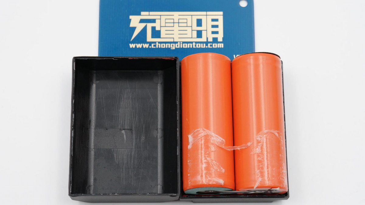 將電池盒拆開,內部一共設有兩顆鋰電池,電池一端貼有雙面膠幫助固定。