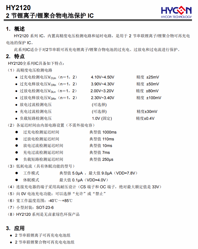 HYCON宏康HY2120 2串鋰電池保護IC,配合MOS管進行電池的過充過放保護。