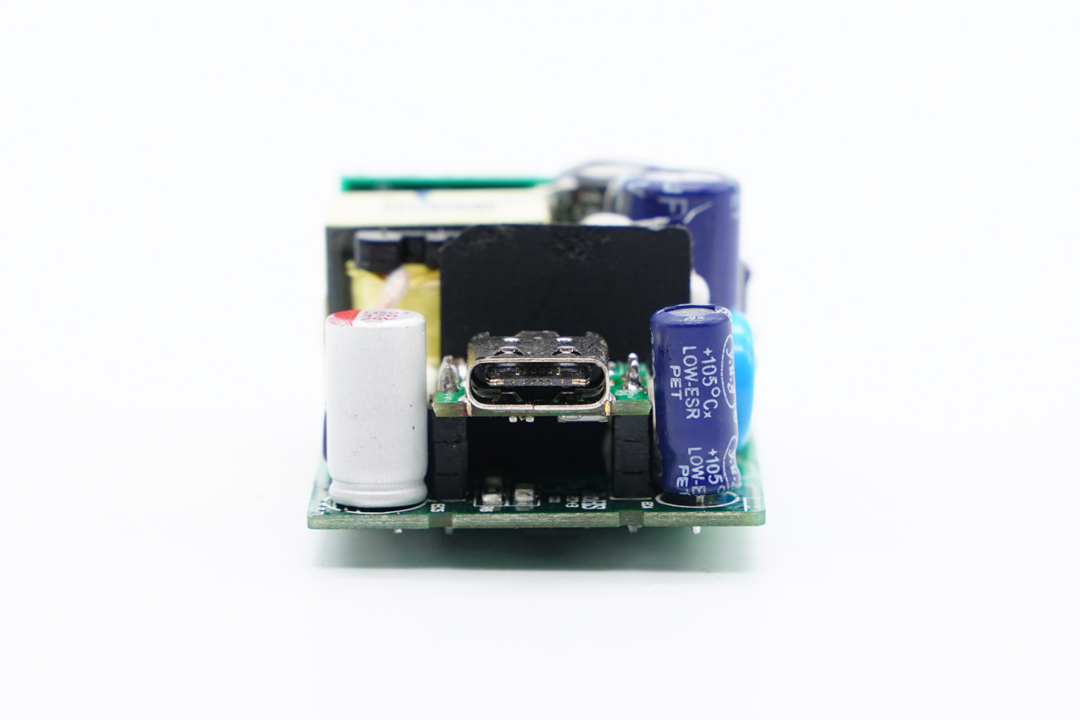 輸出端一覽,USB-C母座使用小板焊接,兩側各有一顆濾波電容。
