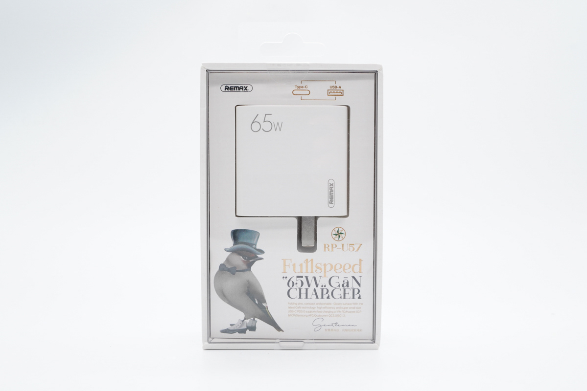 包裝盒采用櫥窗式設(shè)計,可直接觀察充電器實體,展示效果更好。此外盒子紙板上設(shè)有REMAX品牌、充電器型號以及紳士鳥等。