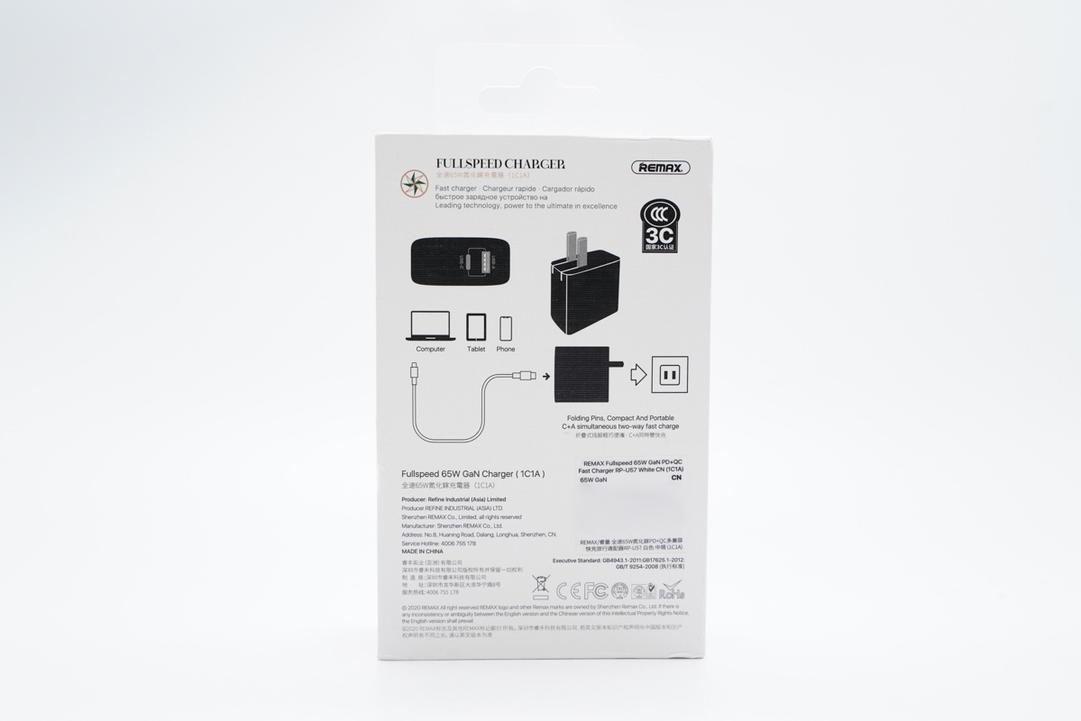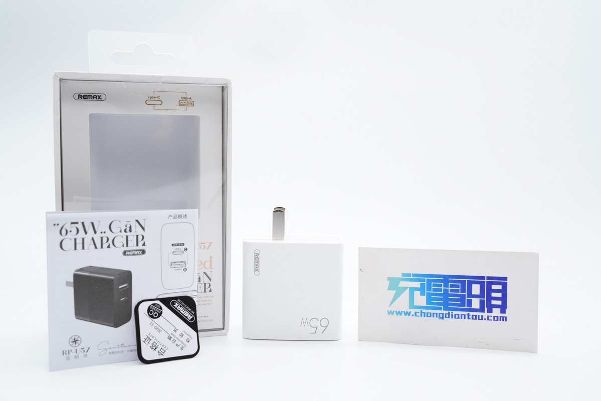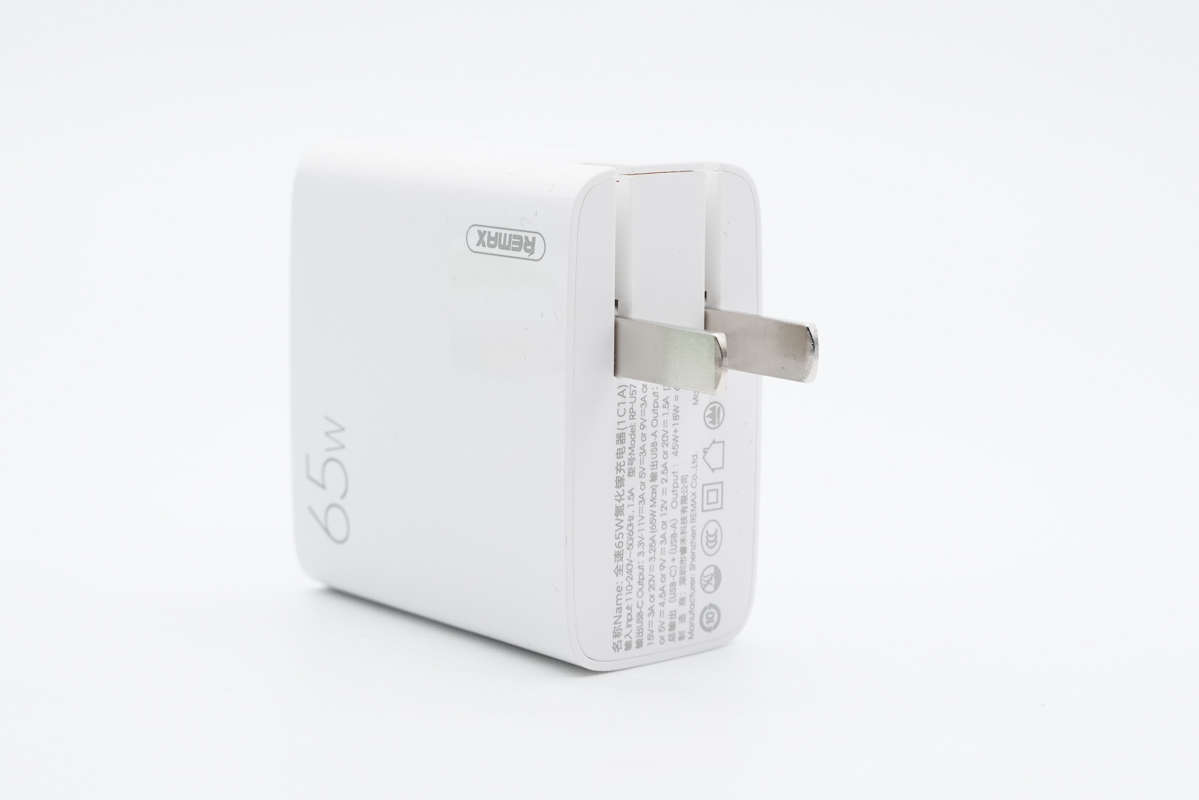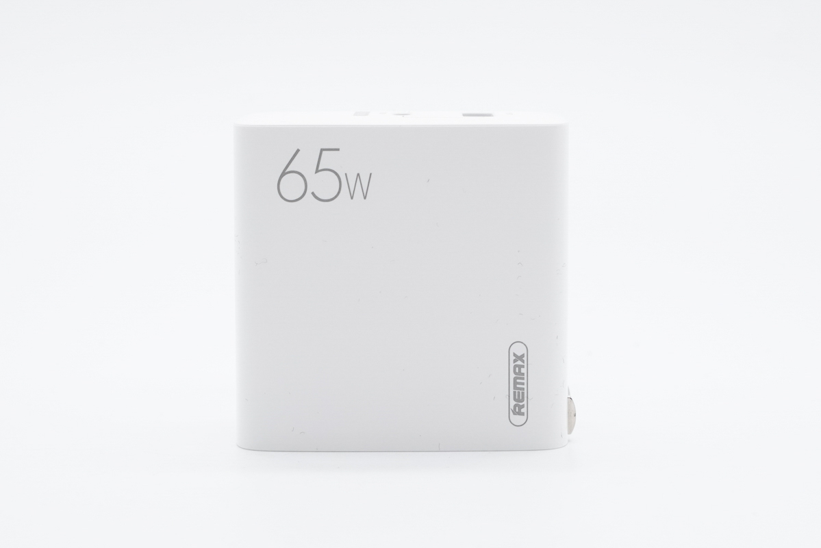 這款充電器采用方塊造型設(shè)計,采用PC阻燃材質(zhì)白色外殼,腰身正面設(shè)有REMAX品牌logo和65W快充標識。