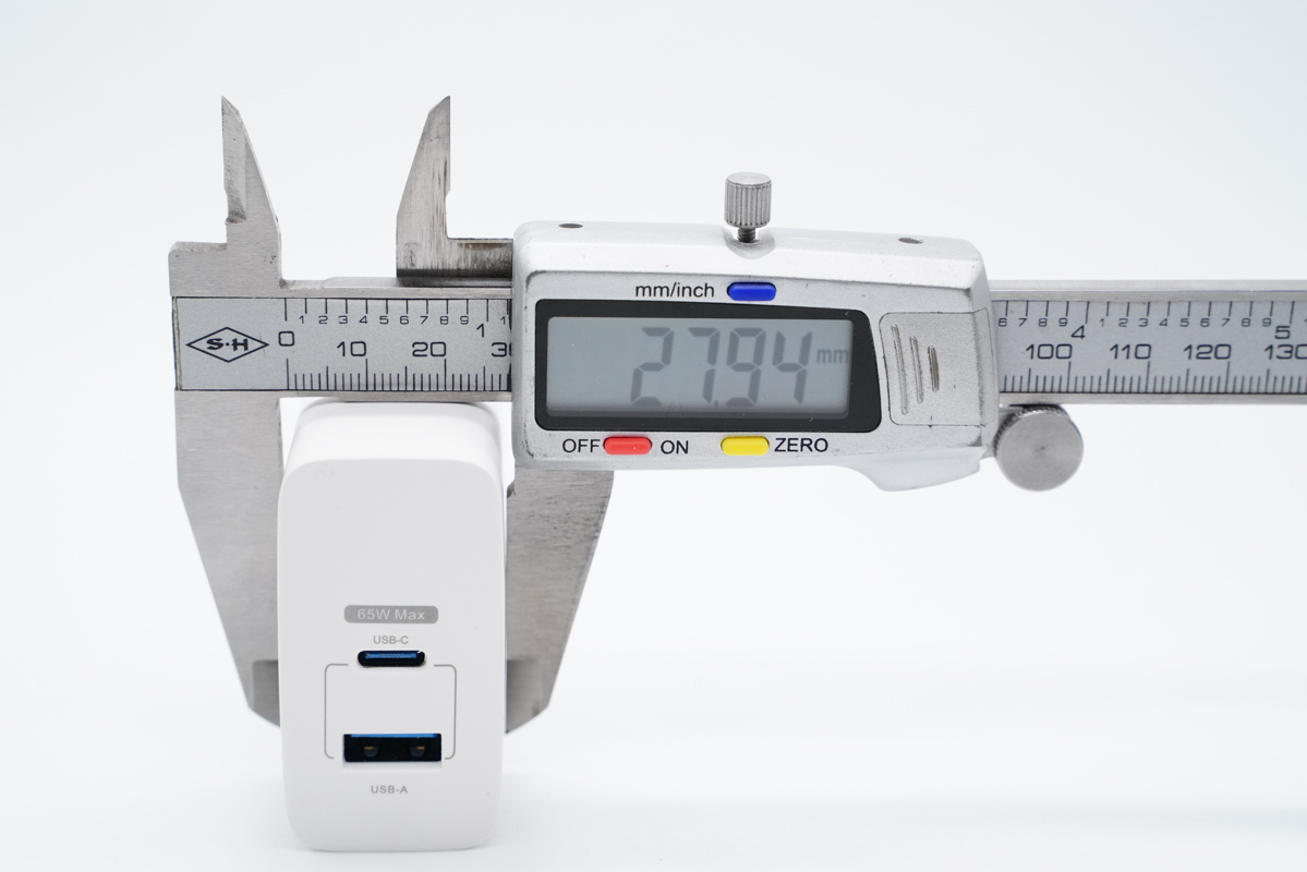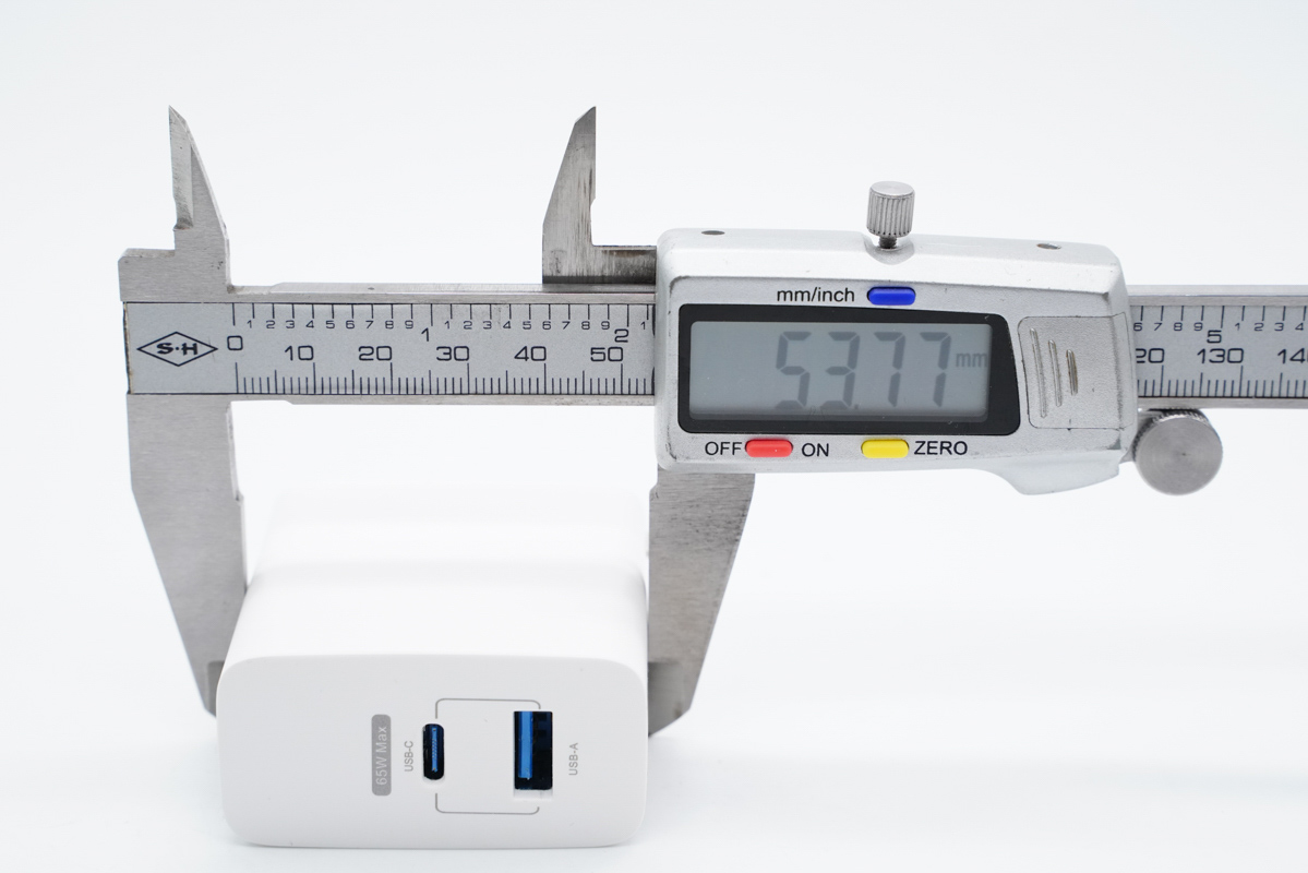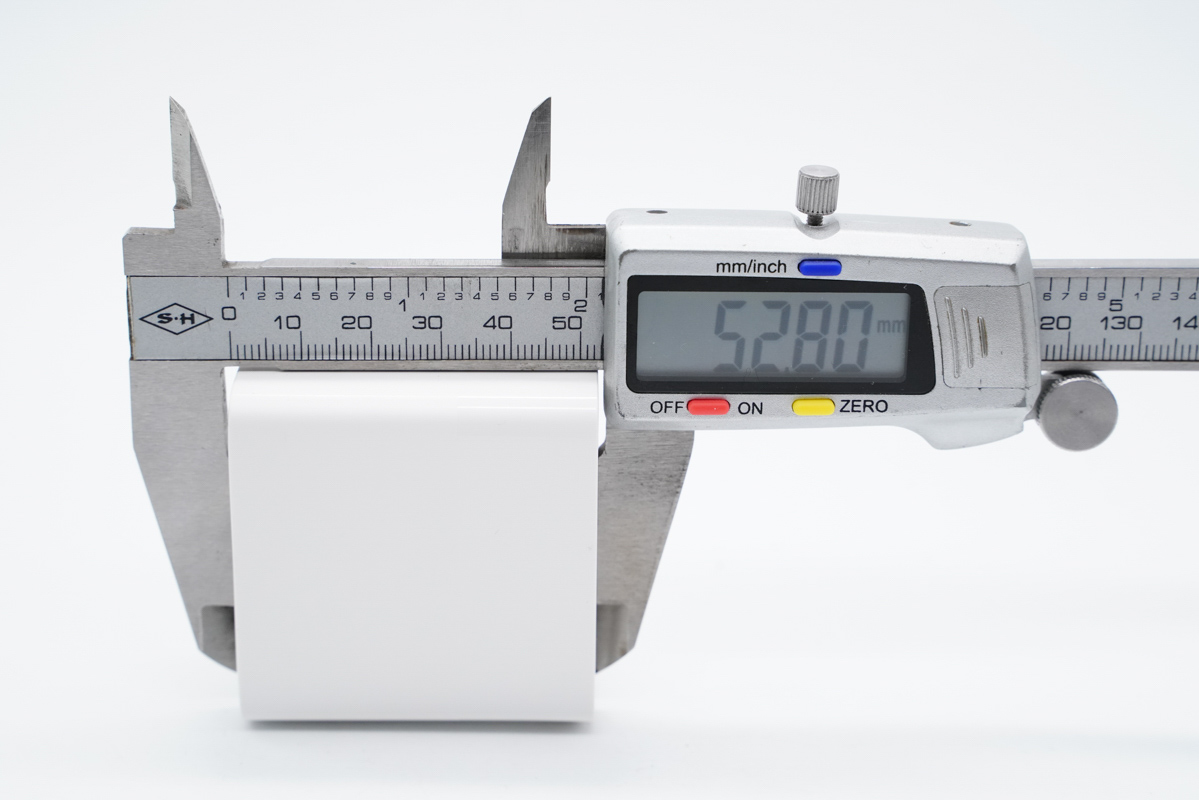 使用游標卡尺實測充電器機身長度為52.8mm。