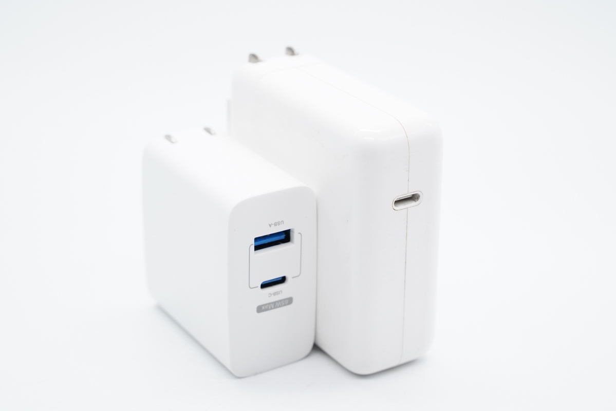 和蘋果61W充電器直觀對比,體積優(yōu)勢非常明顯。
