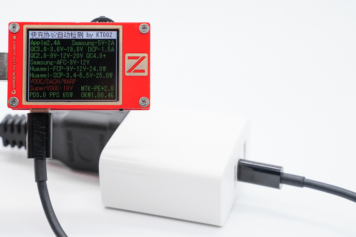 使用ChargerLAB POWER-Z KT002檢測USB-A口的輸出協(xié)議,顯示支持Apple 2.4A、Samsung 5V2A和DCP協(xié)議,以及QC2.0/3.0、AFC、FCP、SCP、PE2.0多個快充協(xié)議。