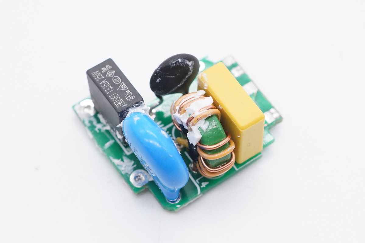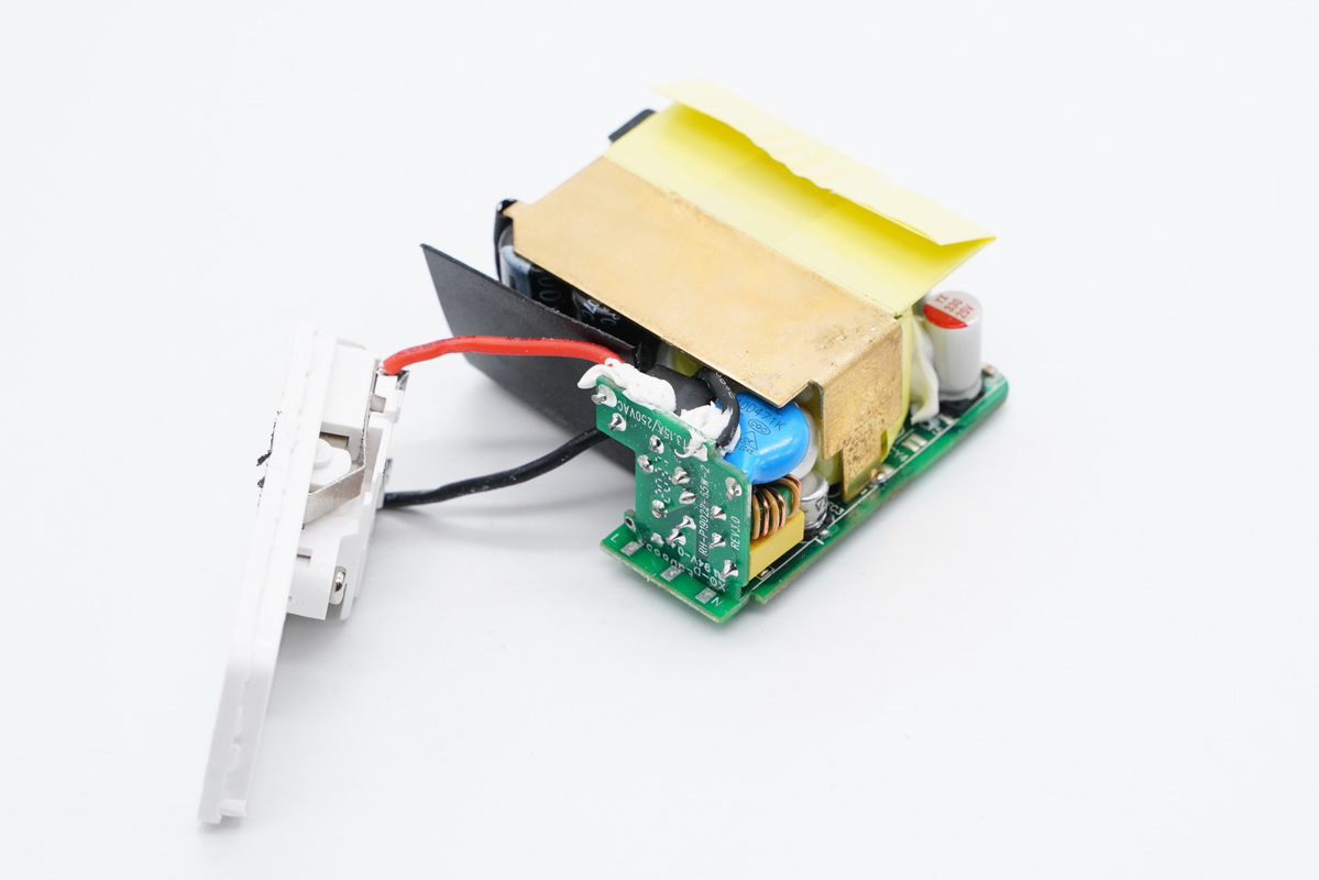 折疊插腳和PCB板通過紅黑AC導(dǎo)線連接通電,初級側(cè)設(shè)有隔離板和PCB小板。