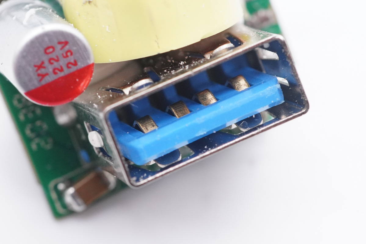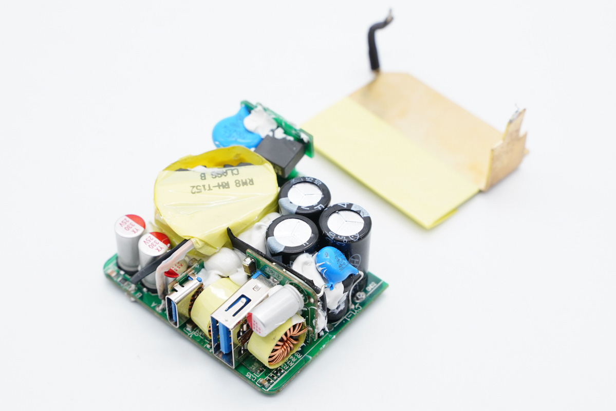 散熱片拆掉,初次級之間有絕緣板隔離,變壓器、電容等元器件打膠加固,輸出端兩個USB母座均使用小板垂直焊接。