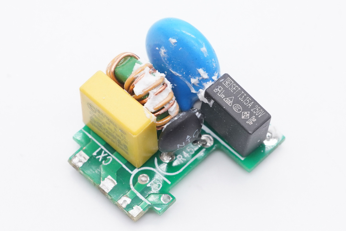 小板正面設(shè)有延時保險絲、NTC浪涌抑制電阻、壓敏電阻、共模電感、X電容這些元器件,用于輸入濾波和保護功能。