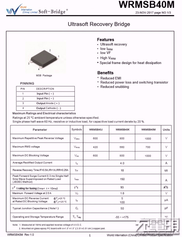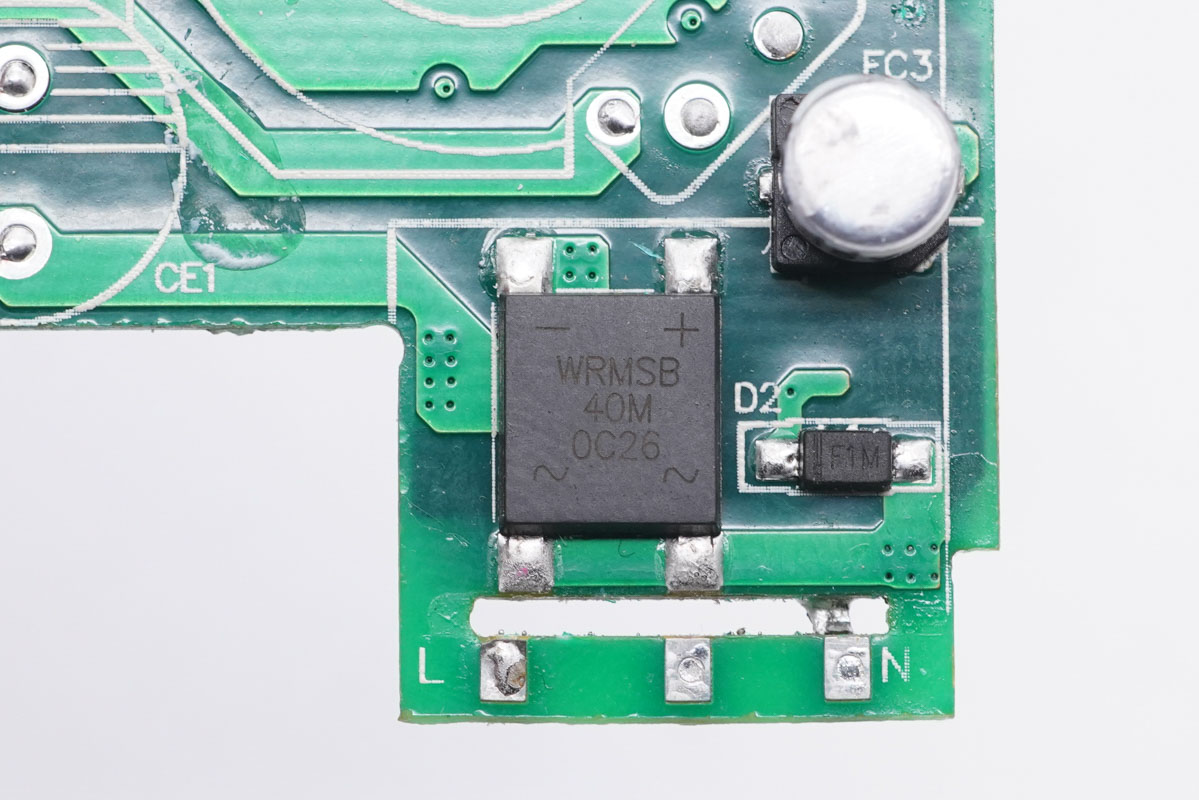 小板下方設(shè)有整流橋,沃爾德實業(yè)有限公司的WRMSB40M。這顆軟橋通過較軟的恢復(fù)曲線,比較平滑的關(guān)斷特性,可以降低二極管結(jié)電容達到非常少的諧波振蕩產(chǎn)生的效果。