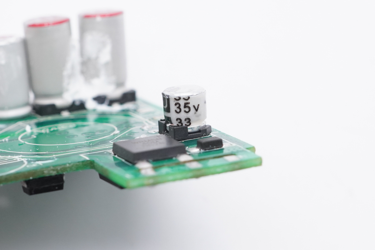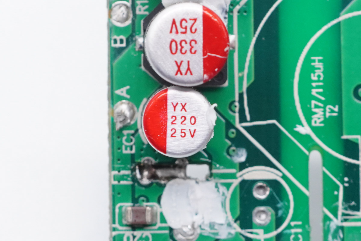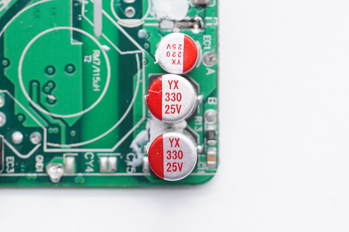 兩顆輸出濾波固態(tài)電容規(guī)格均為25V?330μF,來自福建云星電子有限公司。“YX”牌固態(tài)電容專門針對USB?PD快充設(shè)計,在105℃的工作環(huán)境下仍能保證2000小時的壽命,同時兼具耐高溫、耐大紋波、低ESR等特性。