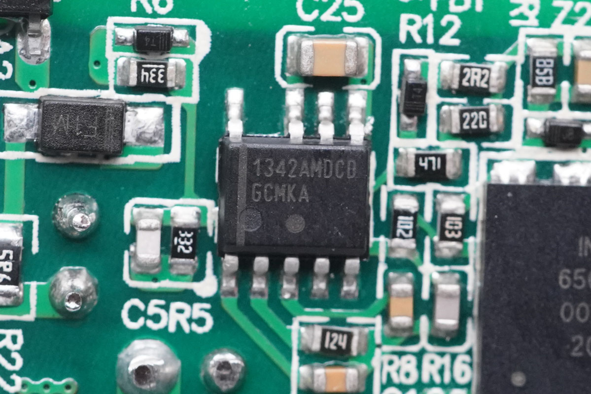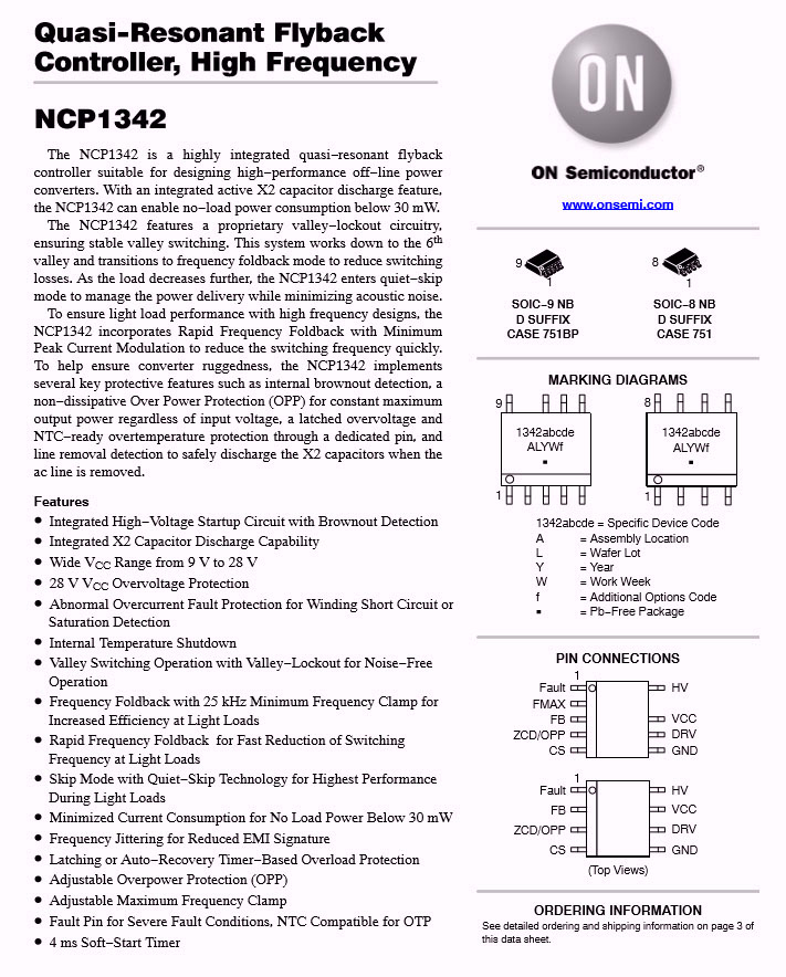 充電器主控芯片為ON安森美NCP1342,這是一顆高頻初級PWM控制器,內(nèi)置主動X2電容放電和多重完善的保護功能,具有超低的待機功耗。