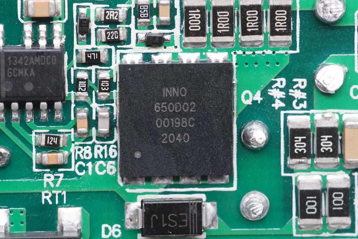 經(jīng)過對PCB板正背面電路分析發(fā)現(xiàn),REMAX?65W?1A1C氮化鎵充電器采用時下熱門的開關(guān)電源定壓輸出,雙路獨立二次降壓輸出的設(shè)計架構(gòu),并且雙口輸出功率由一顆MCU智能分配。下面就從輸入端開始一一了解各元器件的信息。